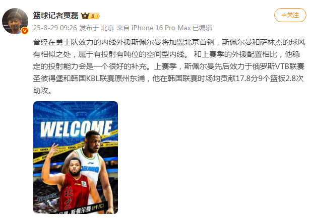 在此前已经有媒体人爆料,表示斯佩尔曼有望加盟一支CBA的北方俱乐部球队。如今贾磊报道是加盟北京男篮,对于“财大气粗”的北京男篮而言,如此引援并不令人意外。